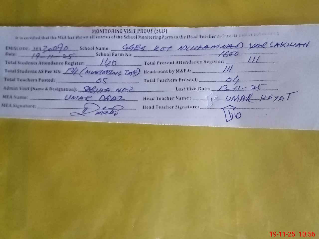 | Attendance Register | Head Teacher | MEA with School | Visit Proof |