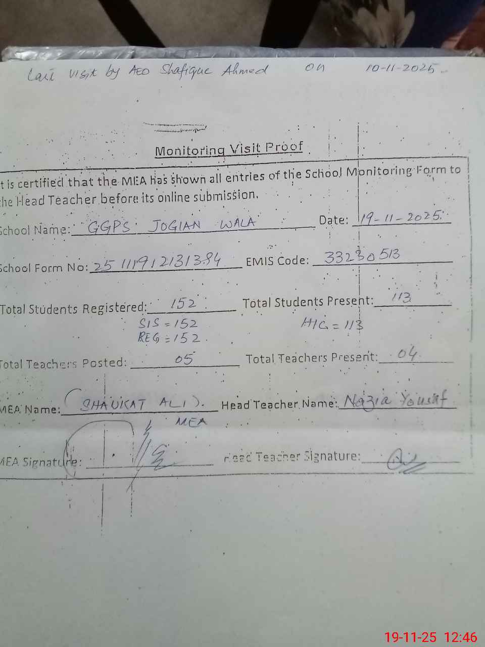 | EMIS Code: 33230513 | Name of School: GGPS JOGIAN WALA | |||