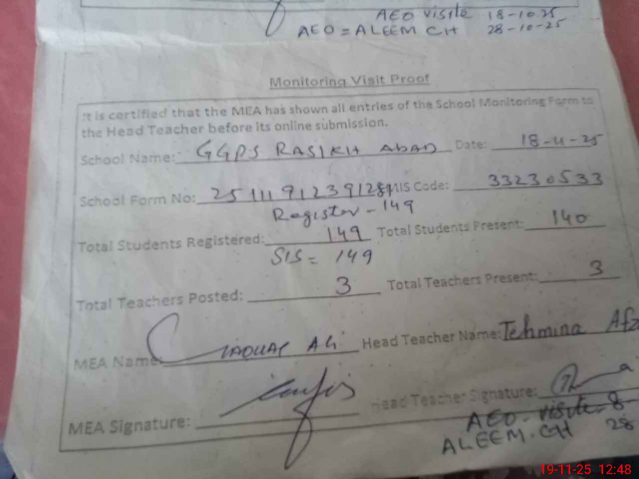 | Attendance Register | Head Teacher | MEA with School | Visit Proof |