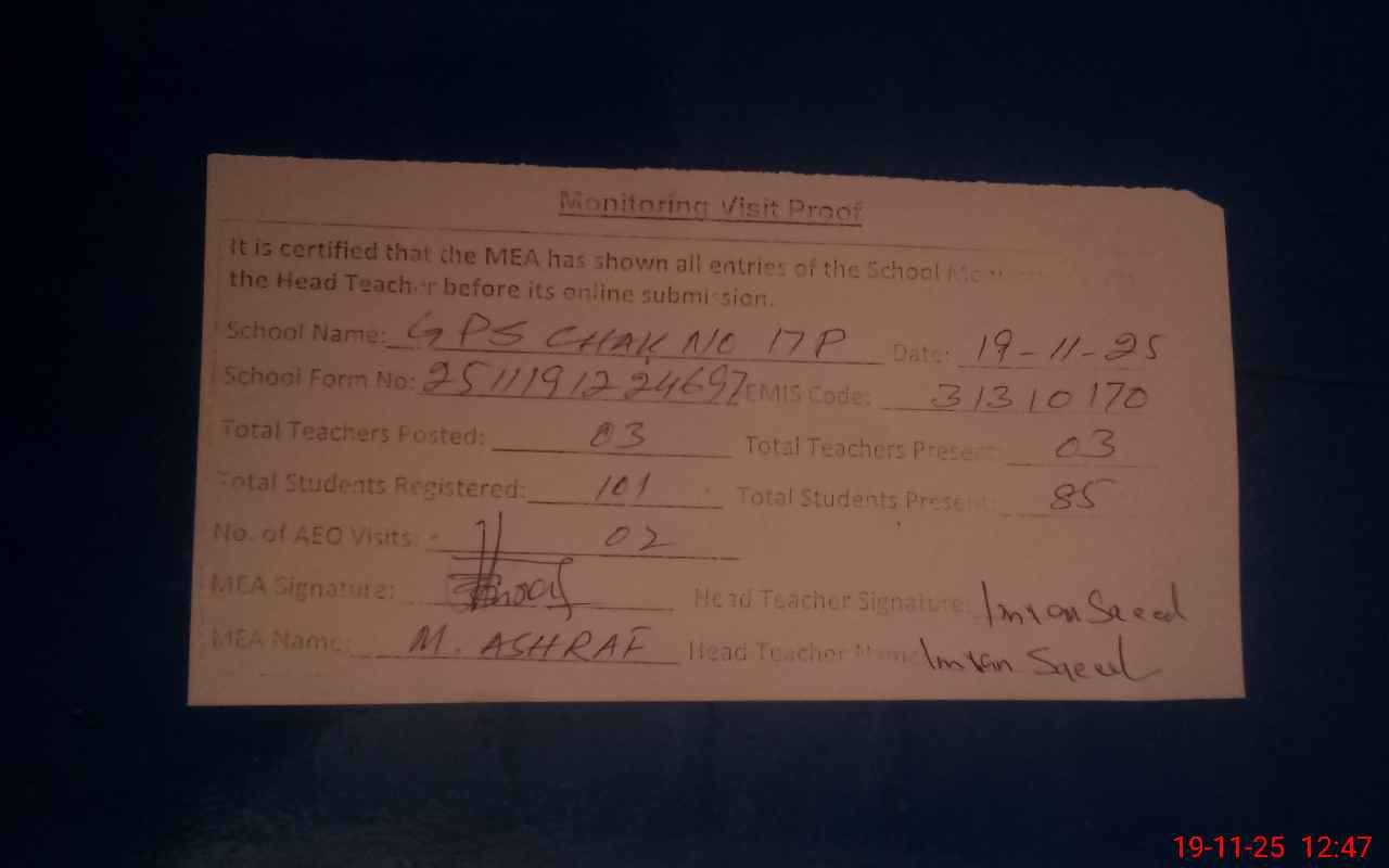 | EMIS Code: 31310170 | Name of School: GPS CHAK NO 17/P KHANPUR | |||