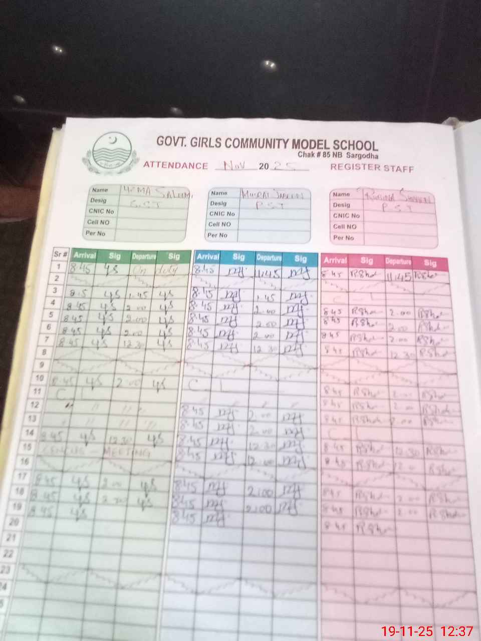 | CNIC | Full Name | Designation | R/C | Absence During Last Calender Month |