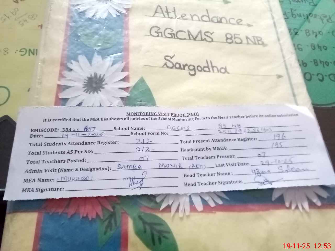 | Attendance Register | Head Teacher | MEA with School | Visit Proof |