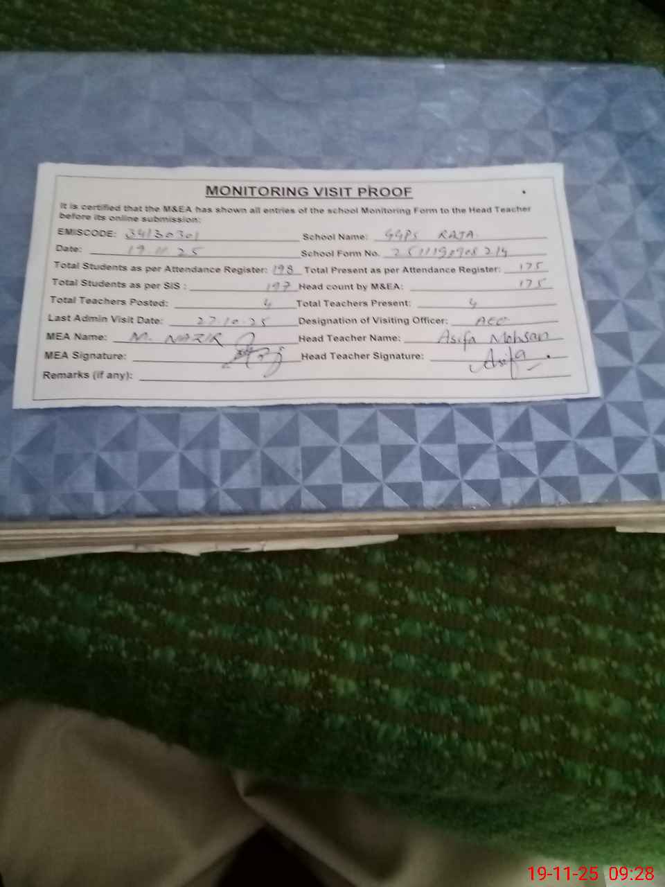 | Attendance Register | Head Teacher | MEA with School | Visit Proof |