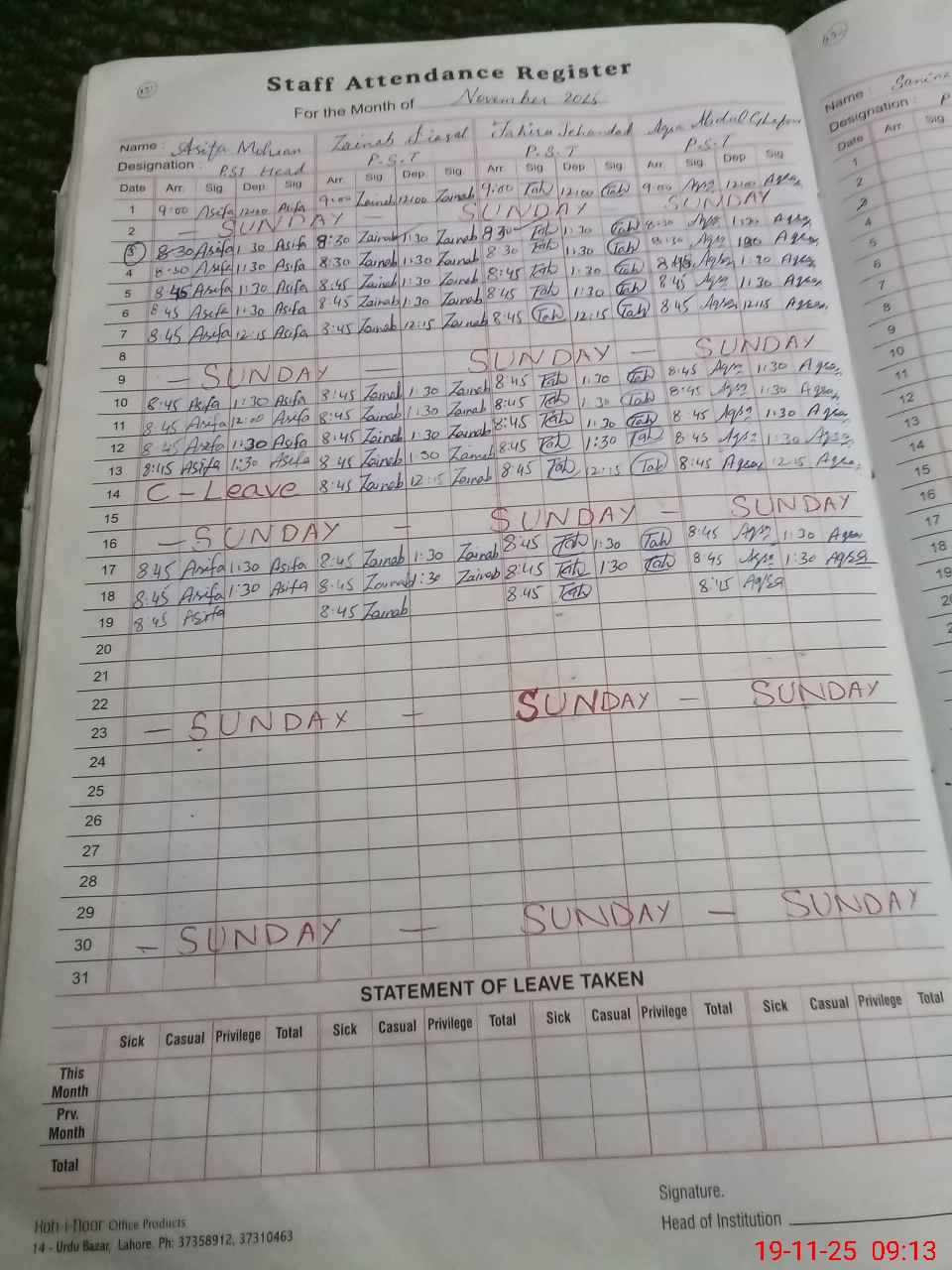 | CNIC | Full Name | Designation | R/C | Absence During Last Calender Month |