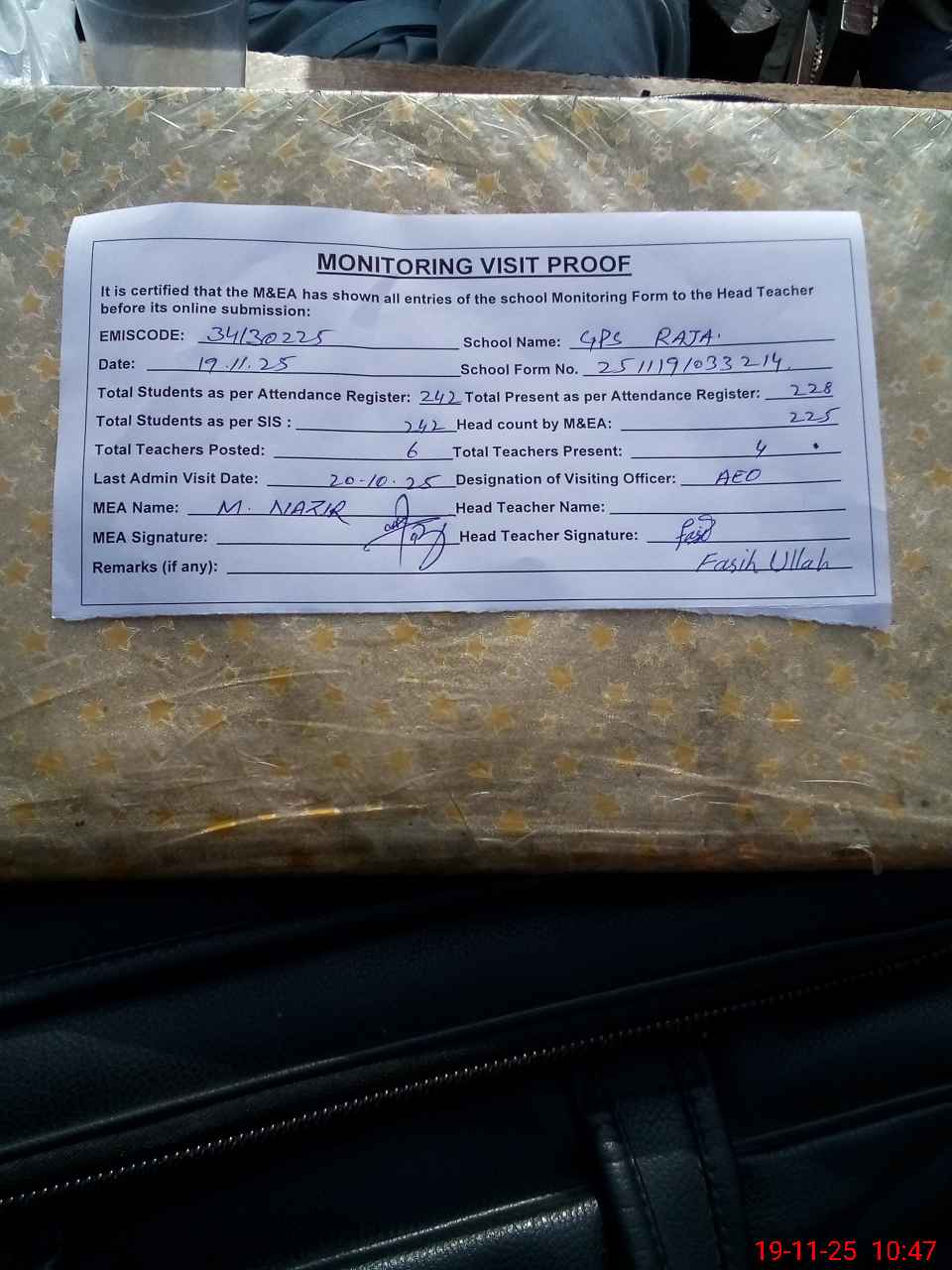 | Attendance Register | Head Teacher | MEA with School | Visit Proof |