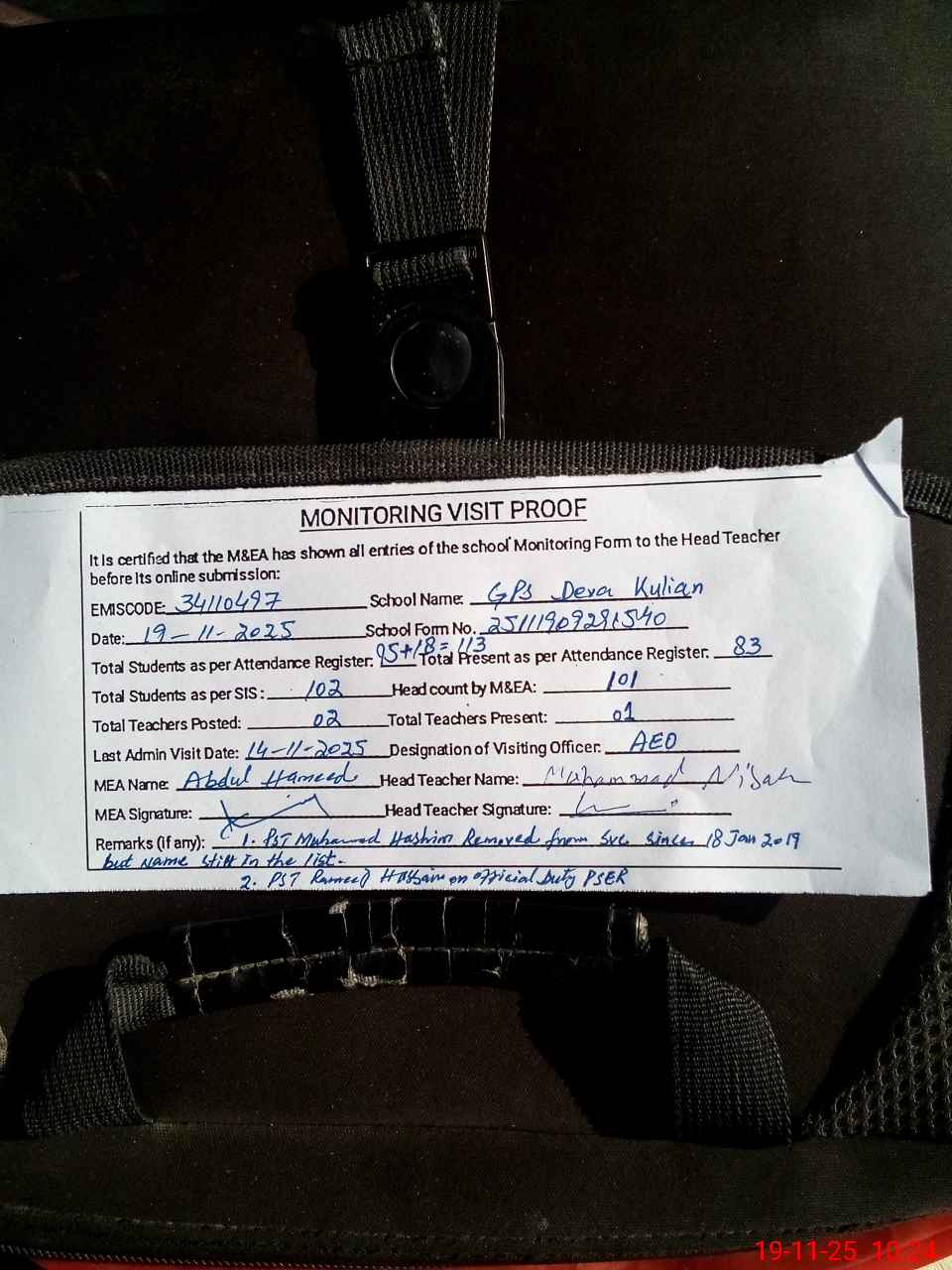| Monitoring Date: 19-11-2025 | Start Time: 19-11-2025 09:29 AM | End Time: 19-11-2025 10:24 AM | Name of MEA: N-**** Ha**** | |