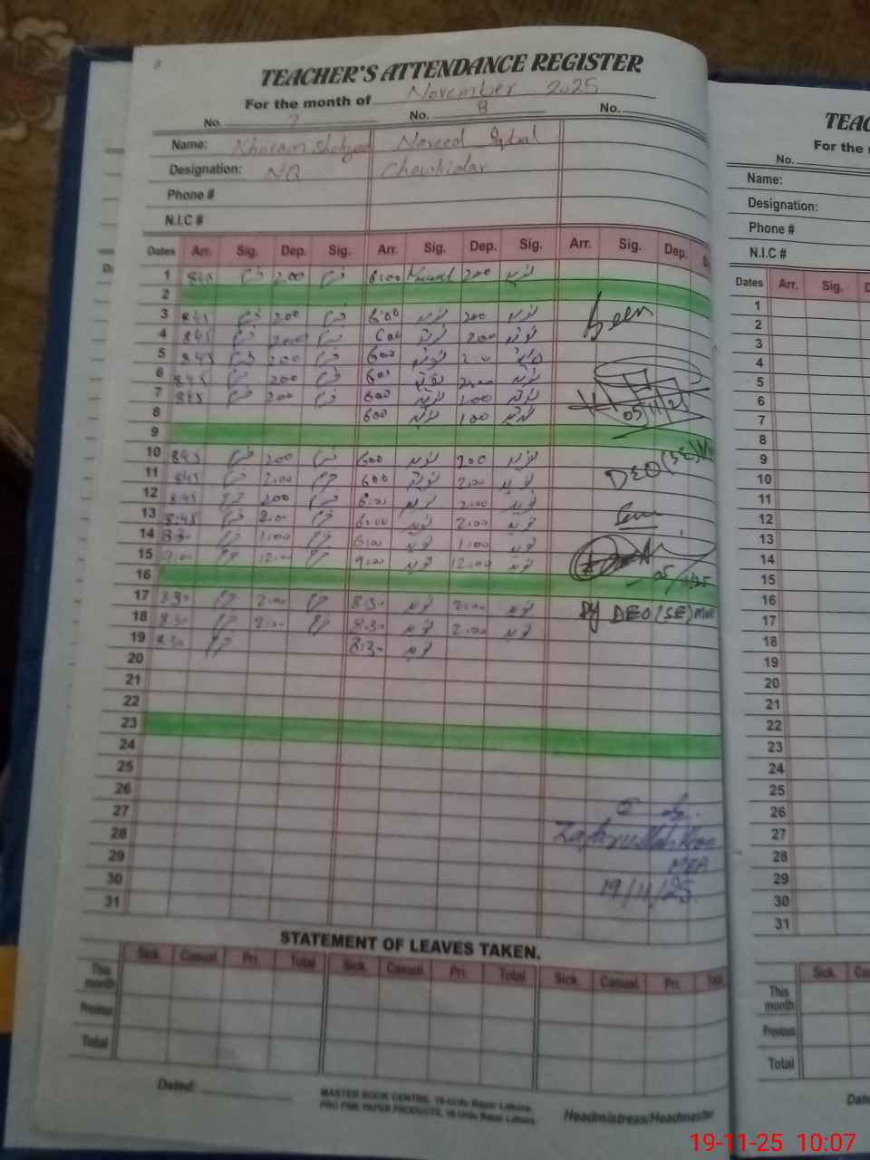 | CNIC | Full Name | Designation | R/C | Absence During Last Calender Month |
