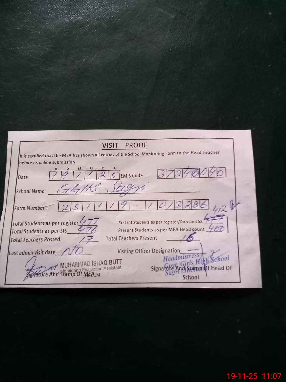 | Attendance Register | Head Teacher | MEA with School | Visit Proof |