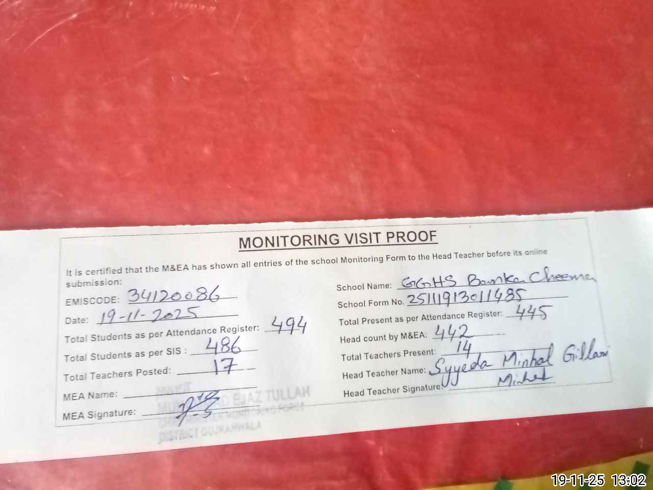| Attendance Register | Head Teacher | MEA with School | Visit Proof |