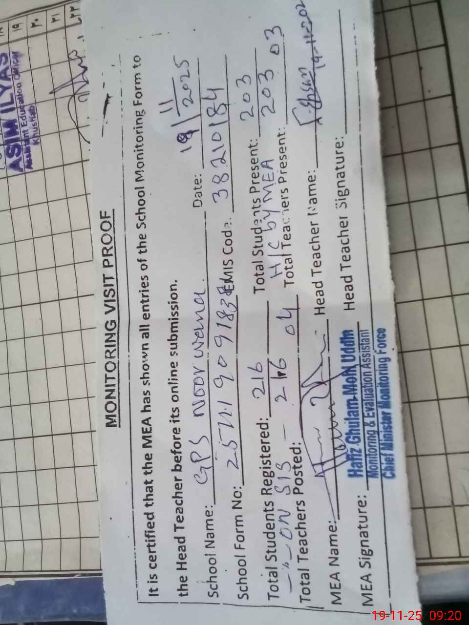 | Attendance Register | Head Teacher | MEA with School | Visit Proof |