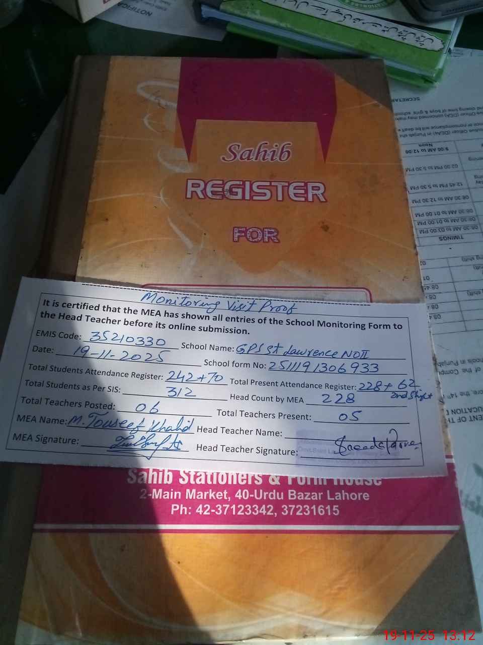 | EMIS Code: 35210330 | Name of School: GPS ST LAWARENCE NO II NAWAZ SHARIF COLONY | |||