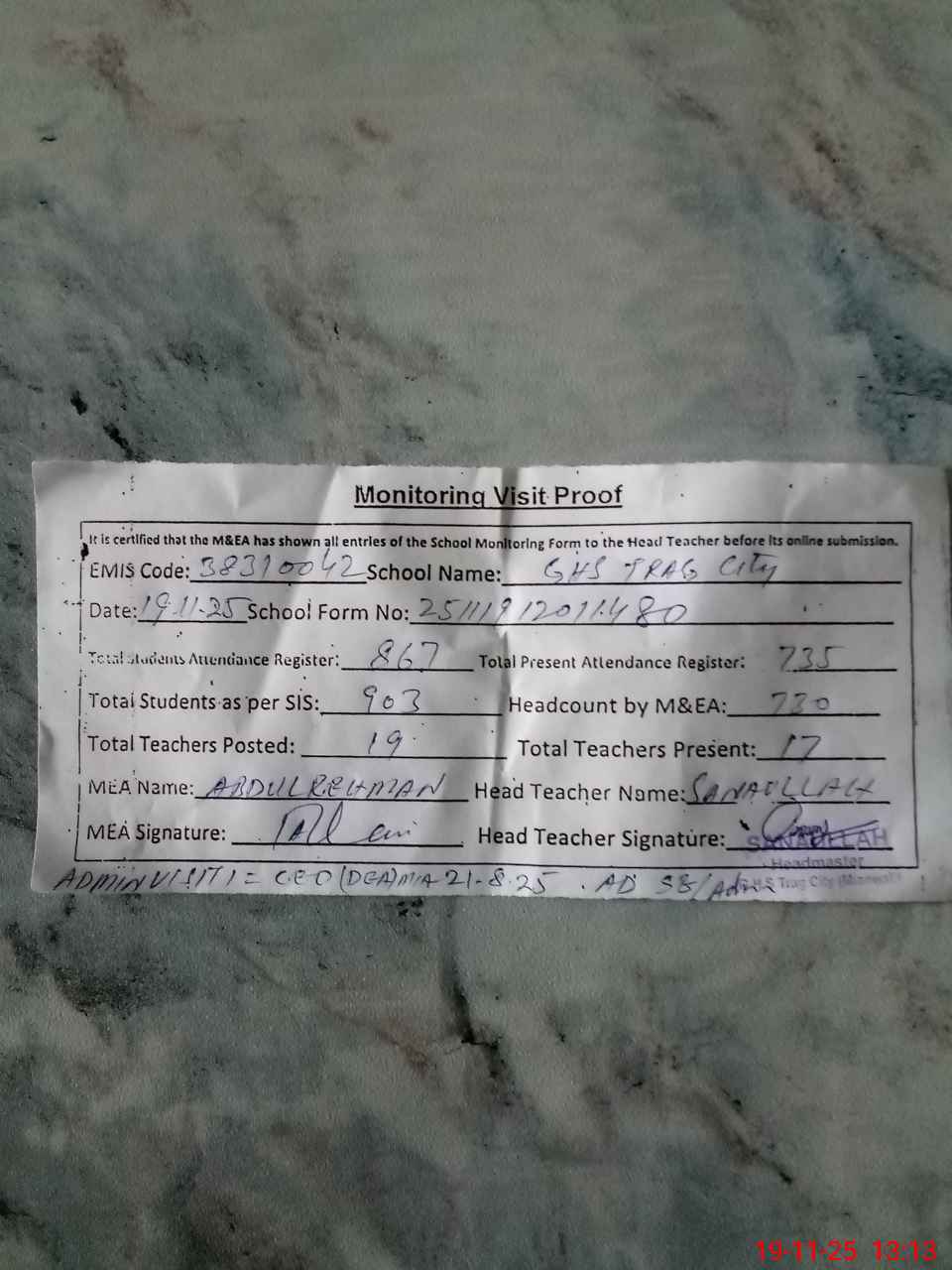 | Attendance Register | Head Teacher | MEA with School | Visit Proof |