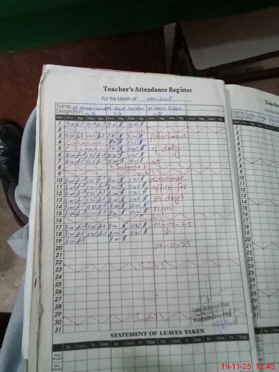 | CNIC | Full Name | Designation | R/C | Absence During Last Calender Month |