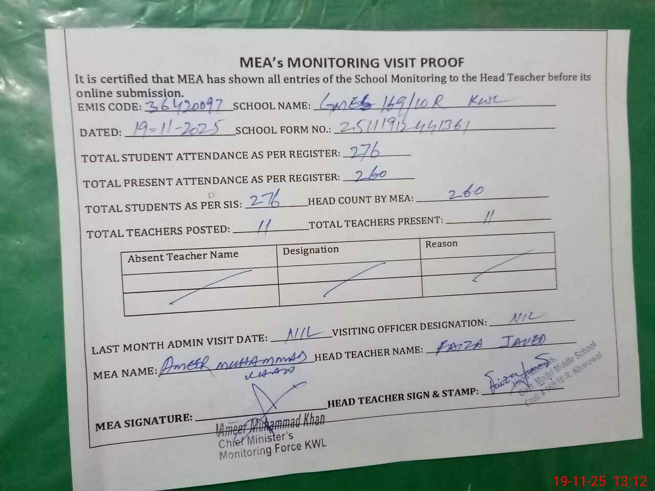 | Attendance Register | Head Teacher | MEA with School | Visit Proof |