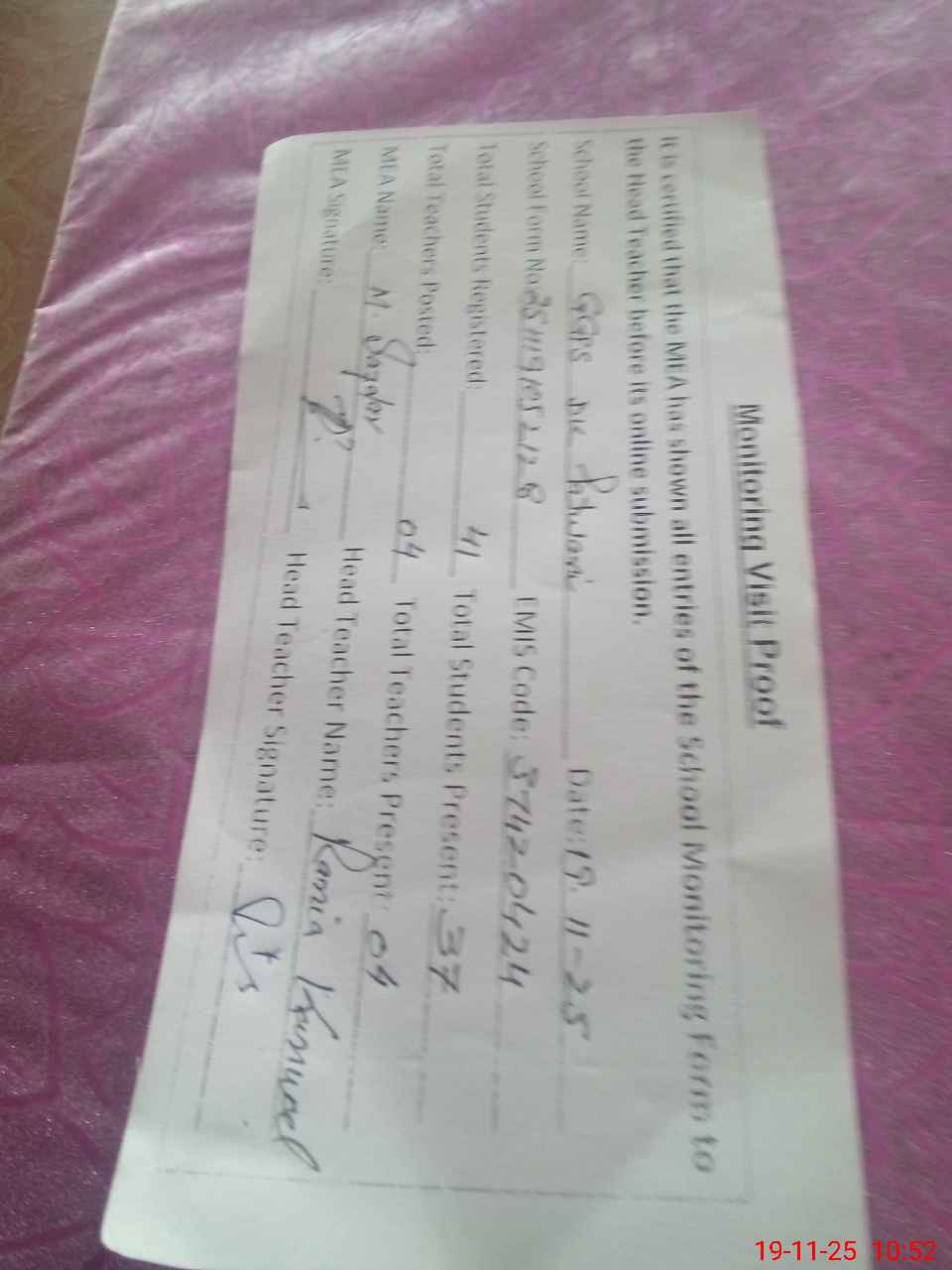 | Attendance Register | Head Teacher | MEA with School | Visit Proof |