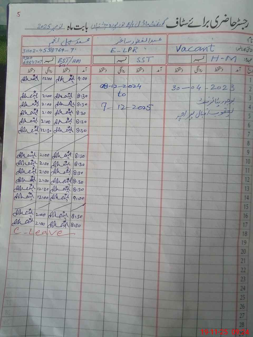 | CNIC | Full Name | Designation | R/C | Absence During Last Calender Month |