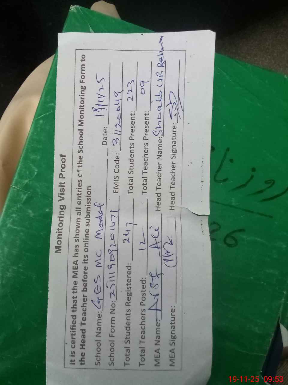 | Attendance Register | Head Teacher | MEA with School | Visit Proof |