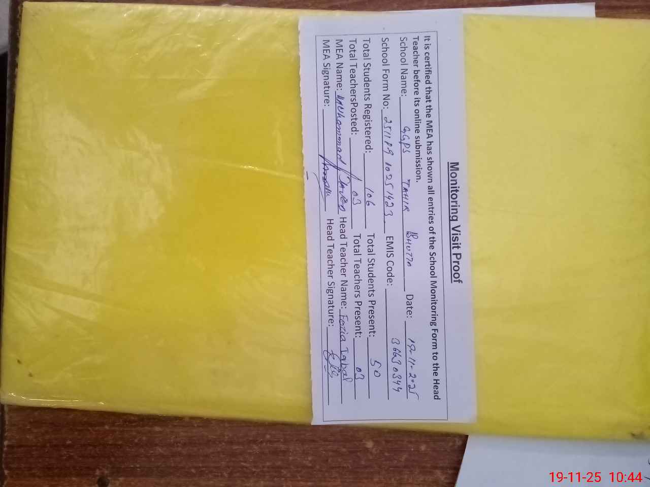 | Attendance Register | Head Teacher | MEA with School | Visit Proof |