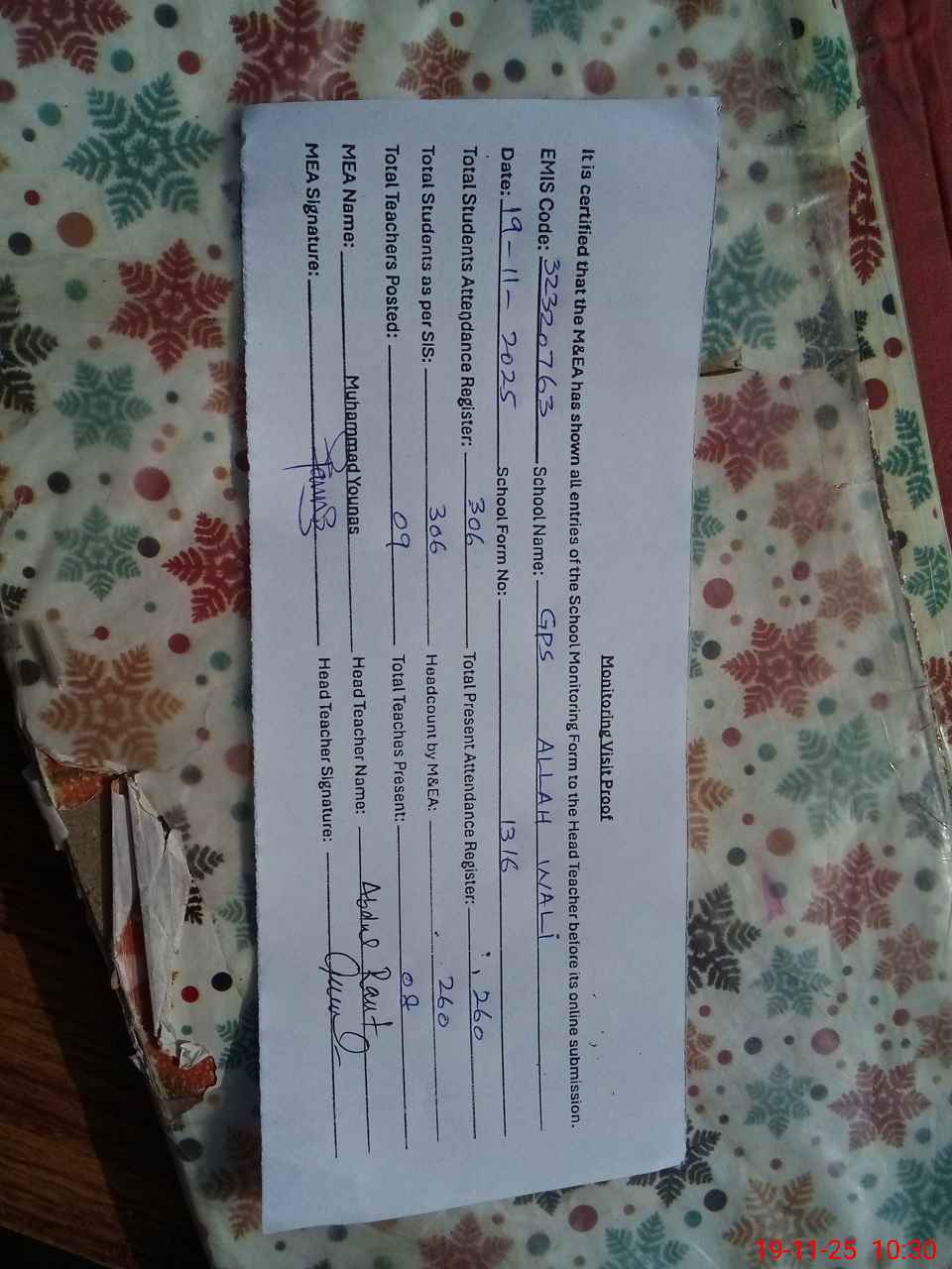 | EMIS Code: 32320763 | Name of School: GPS ALLAH WALI | |||