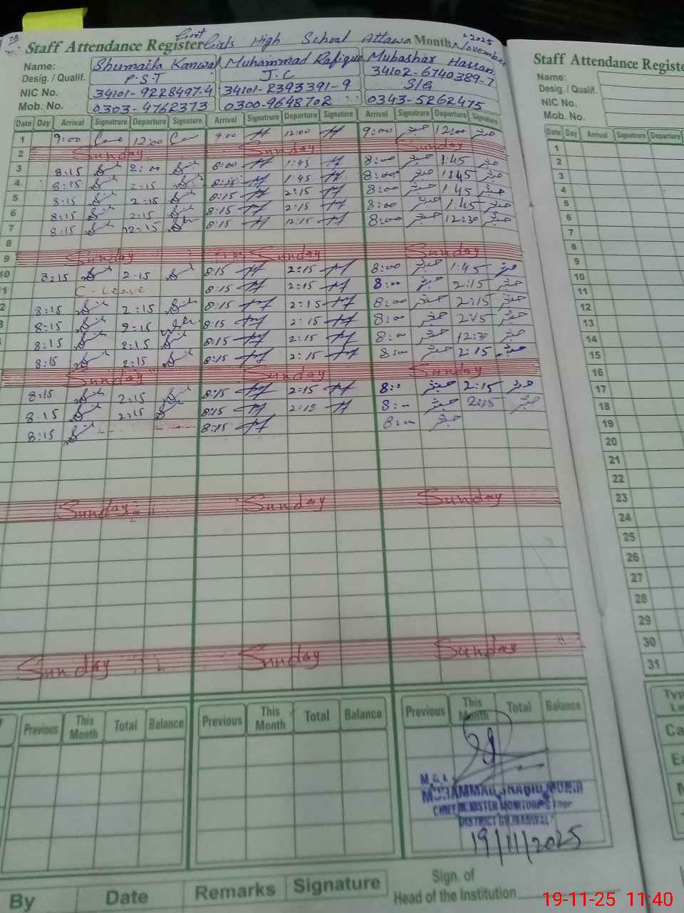 | CNIC | Full Name | Designation | R/C | Absence during last cal. month |