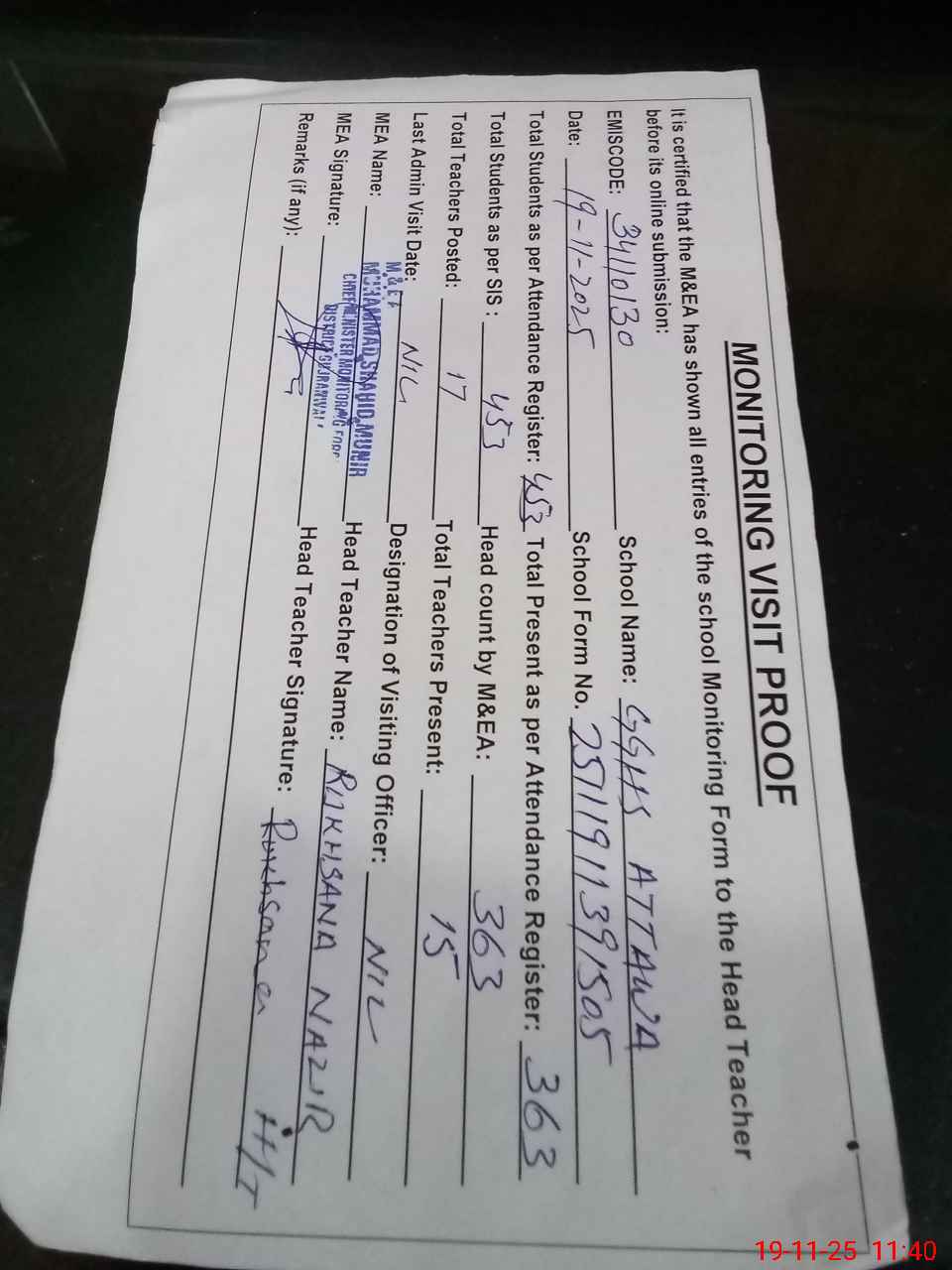 | Attendance Register | Head Teacher | MEA with School | Visit Proof |