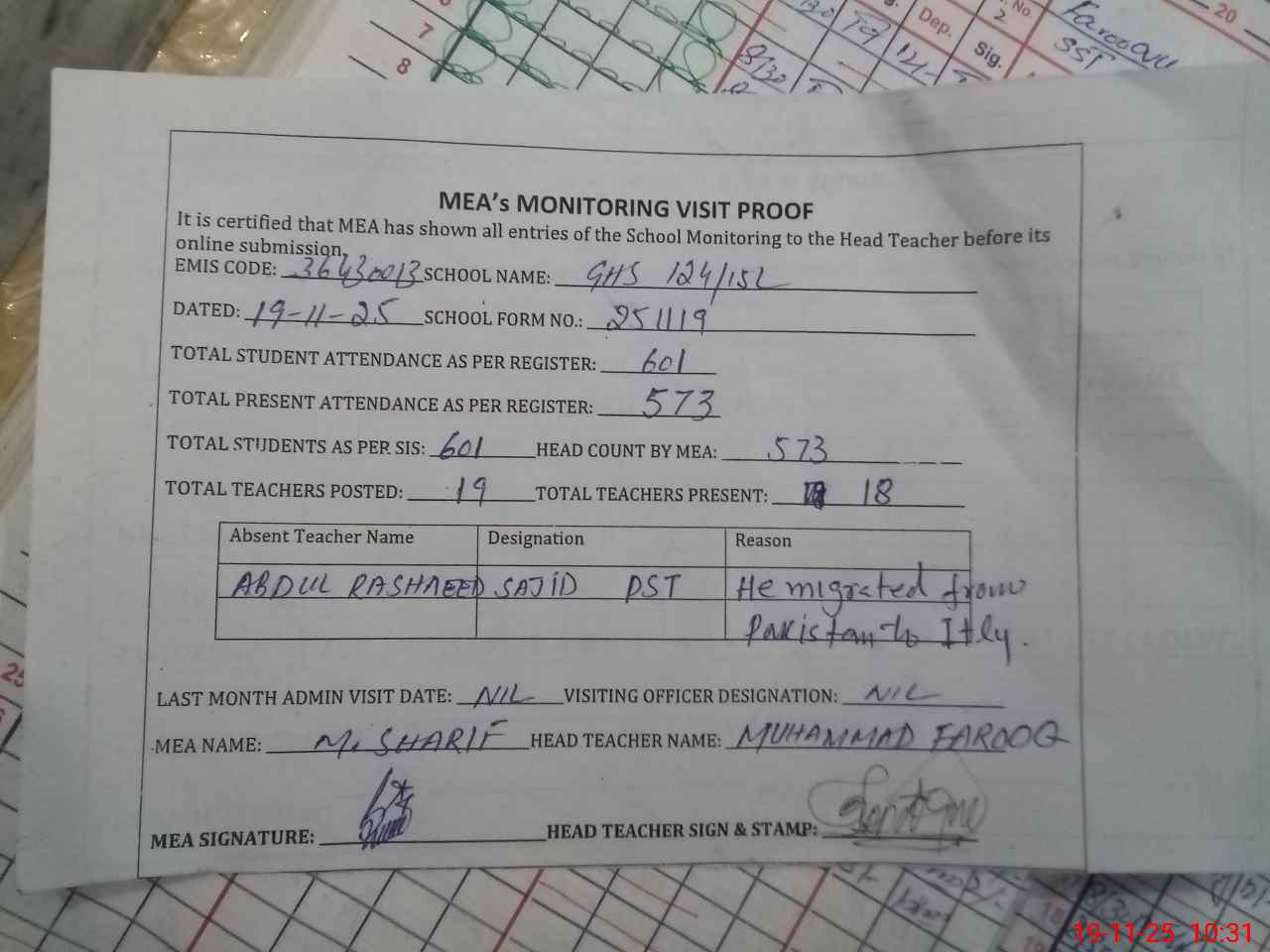 | Remarks (Use Separate Page if Required): Abdul Rasheed Sajid is absent from 22 5 25 He is shifted to abroad Italy He must be removed from service | |||||