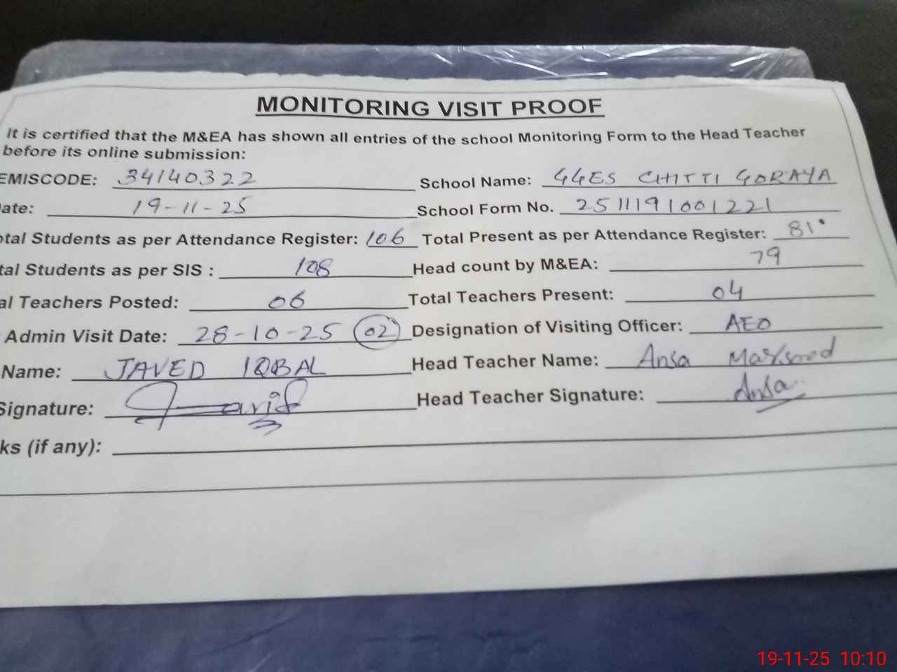 | Monitoring Date: 19-11-2025 | Start Time: 19-11-2025 09:31 AM | End Time: 19-11-2025 10:10 AM | Name of MEA: S-**** Iq**** Sh**** | |