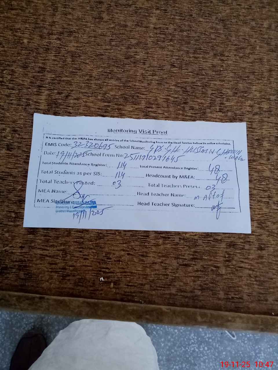 | Attendance Register | Head Teacher | MEA with School | Visit Proof |
