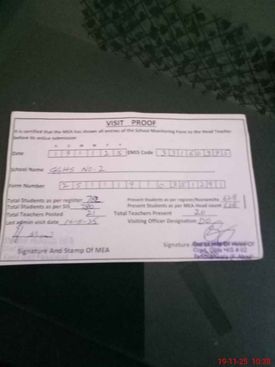 | Attendance Register | Head Teacher | MEA with School | Visit Proof |