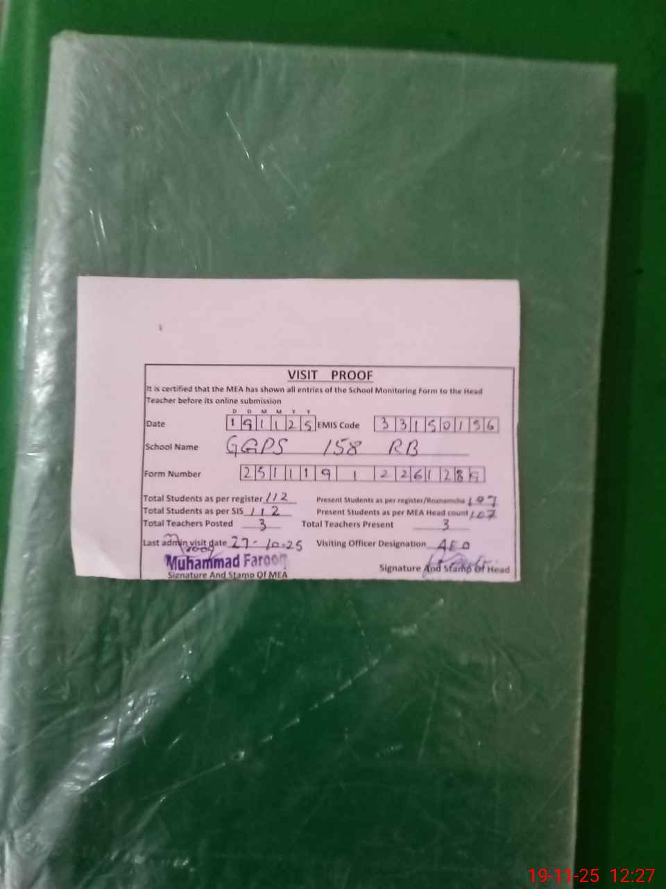 | EMIS Code: 33150156 | Name of School: GGPS CHAK 158 RB BOORRY WALI | |||