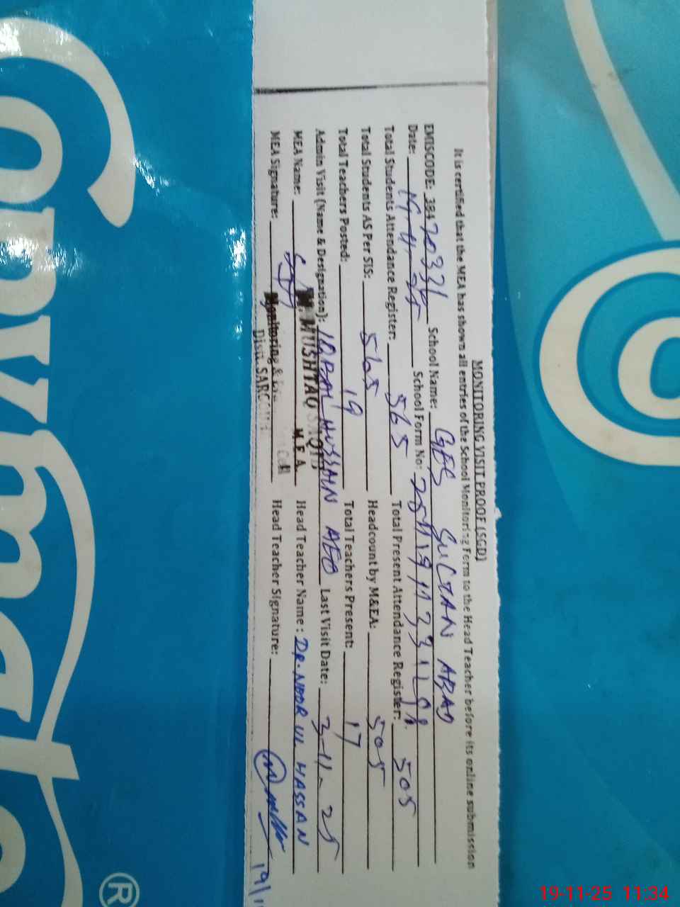 | Attendance Register | Head Teacher | MEA with School | Visit Proof |