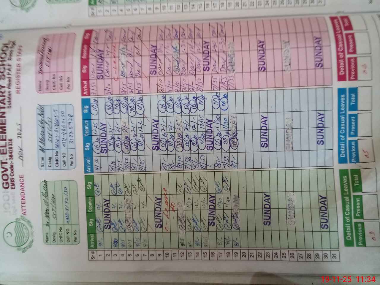 | CNIC | Full Name | Designation | R/C | Absence during last cal. month |
