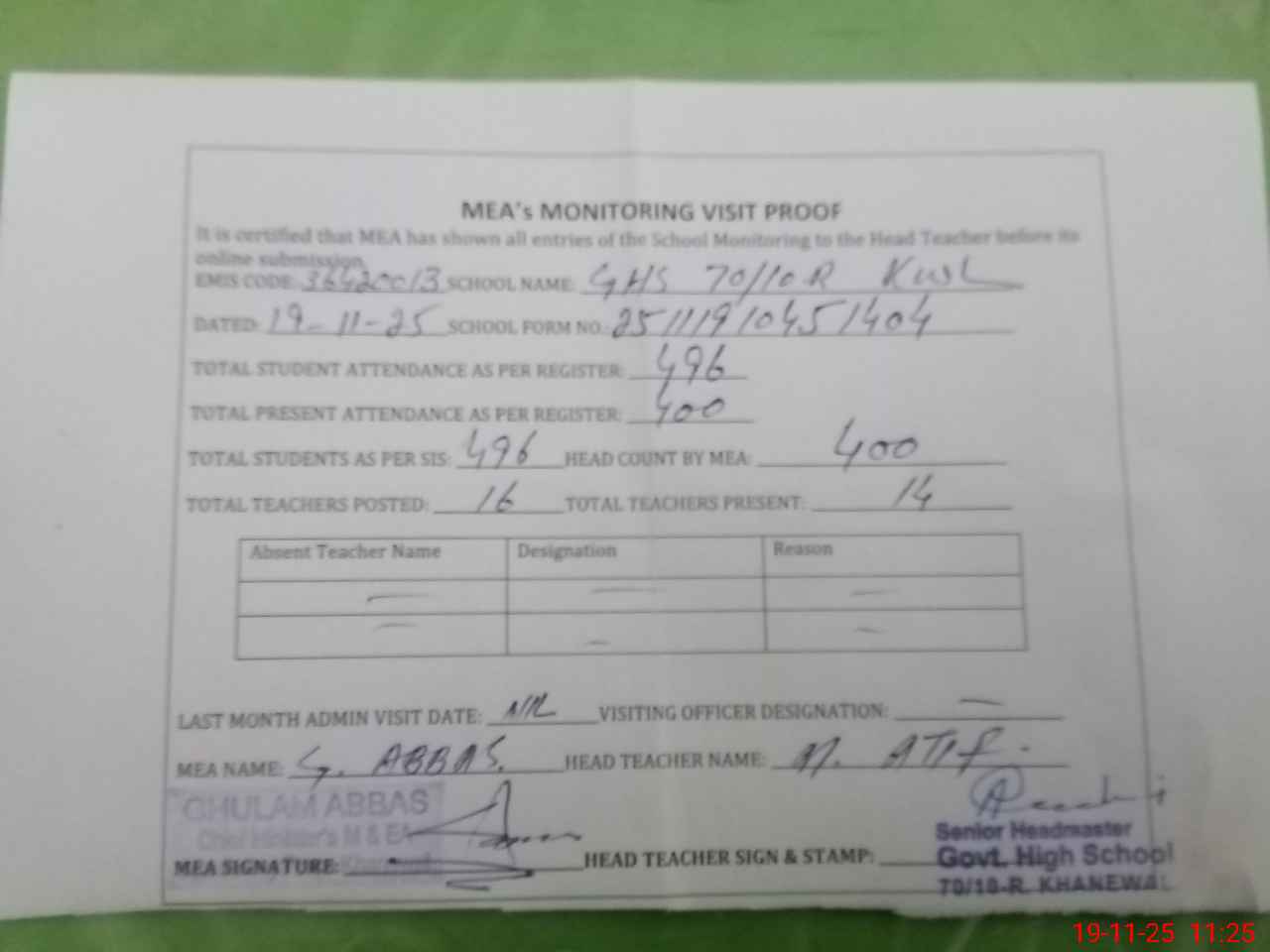 | Attendance Register | Head Teacher | MEA with School | Visit Proof |