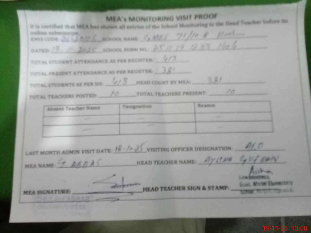 | EMIS Code: 36420106 | Name of School: GMES 71/10-R, KHANEWAL | |||