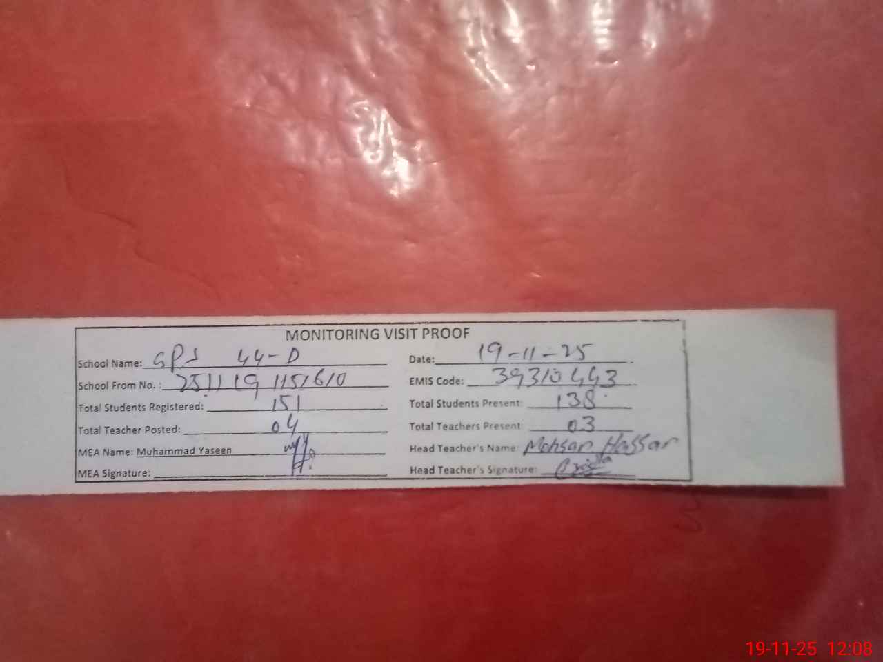 | EMIS Code: 39310443 | Name of School: GPS CHAK NO.44-D | |||