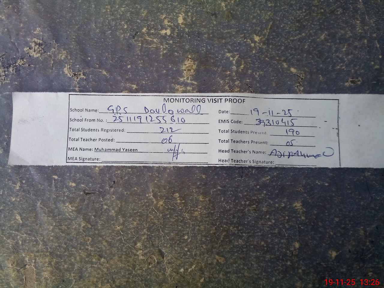 | Attendance Register | Head Teacher | MEA with School | Visit Proof |