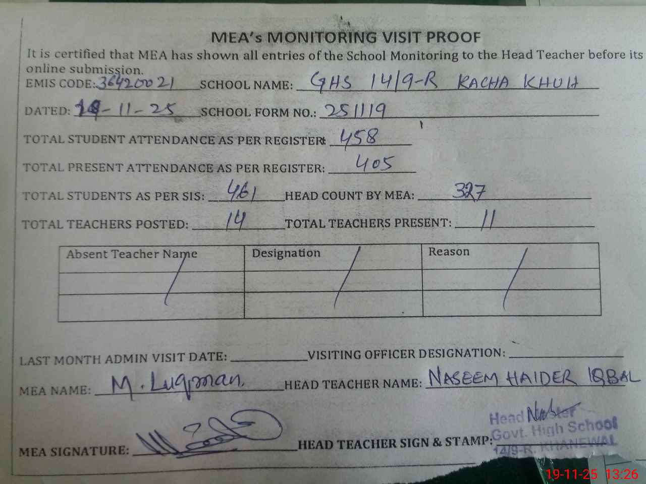 | Attendance Register | Head Teacher | MEA with School | Visit Proof |
