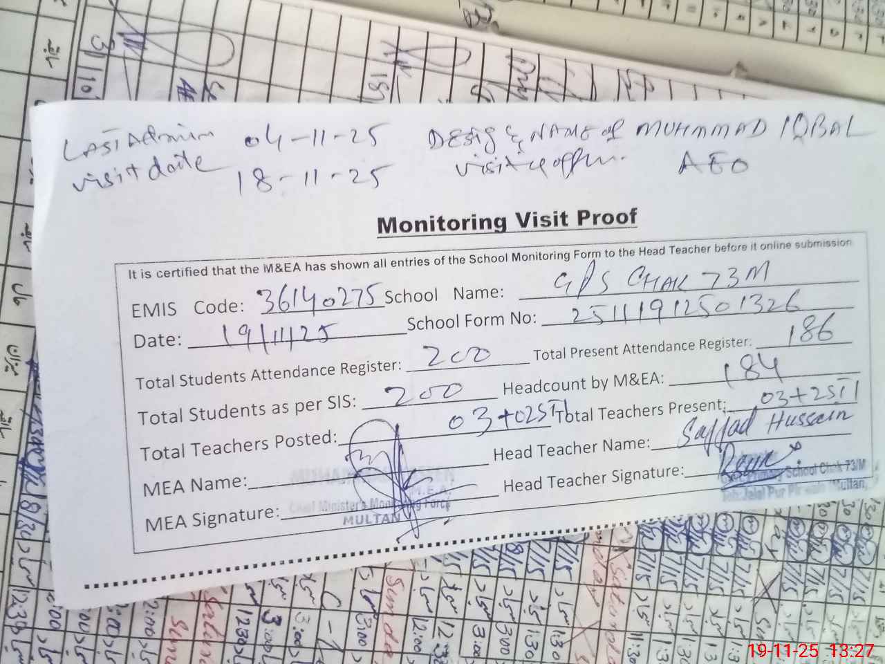 | Attendance Register | Head Teacher | MEA with School | Visit Proof |