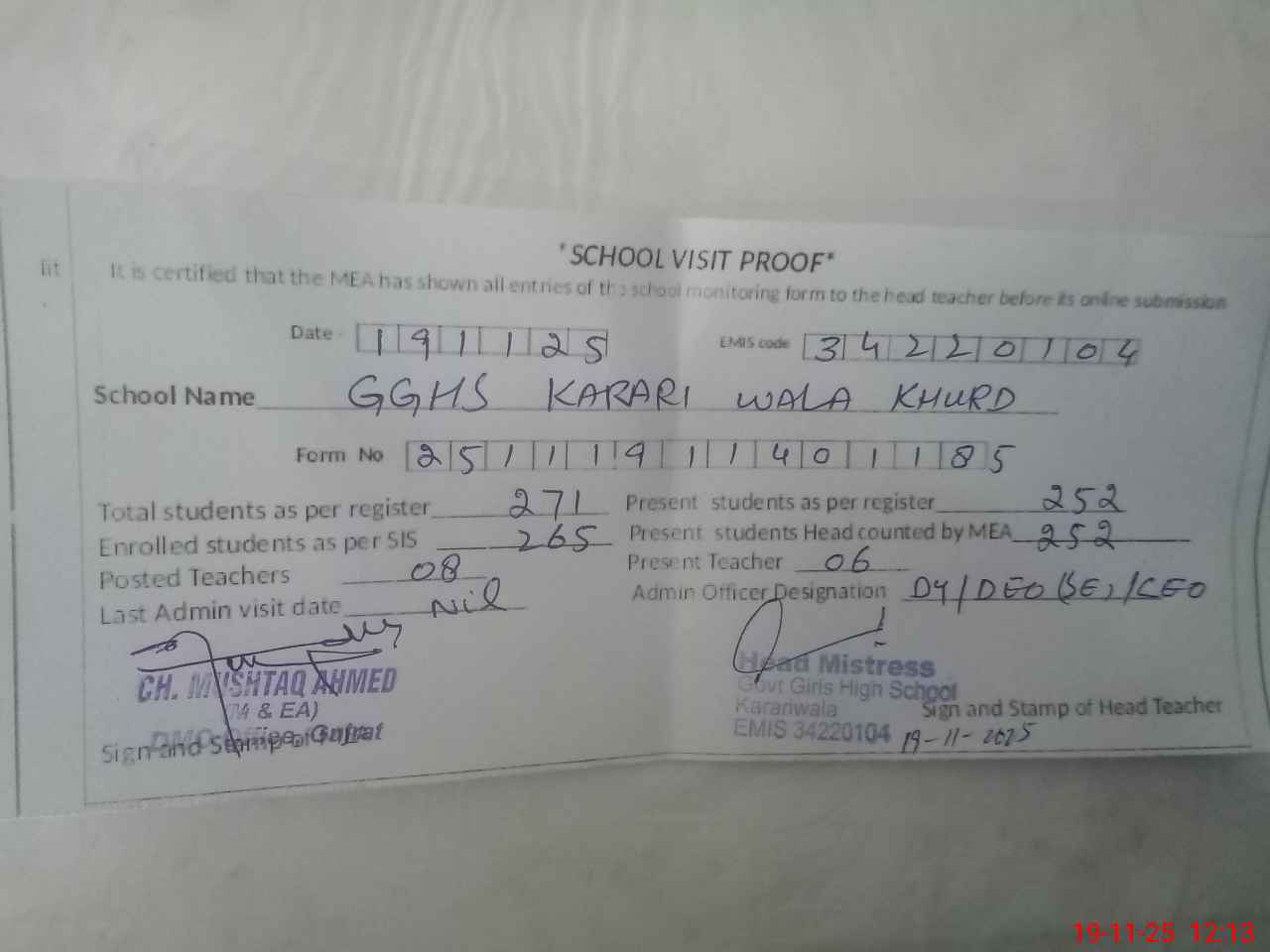 | Attendance Register | Head Teacher | MEA with School | Visit Proof |