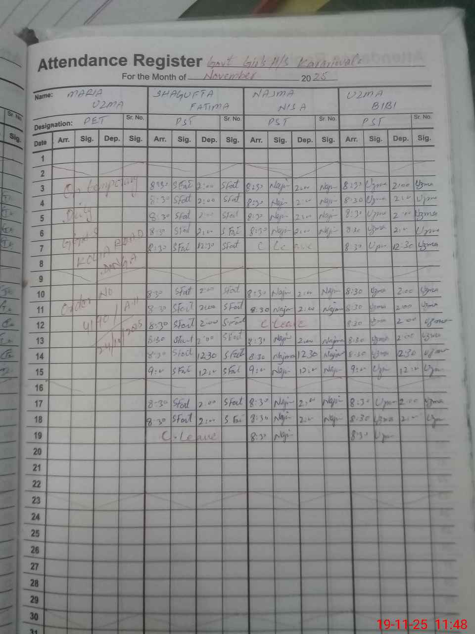 | CNIC | Full Name | Designation | R/C | Absence During Last Calender Month |