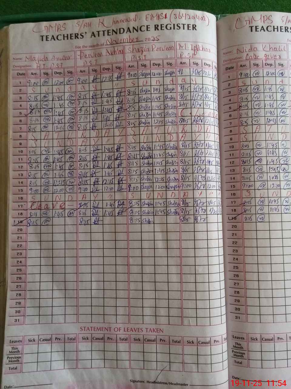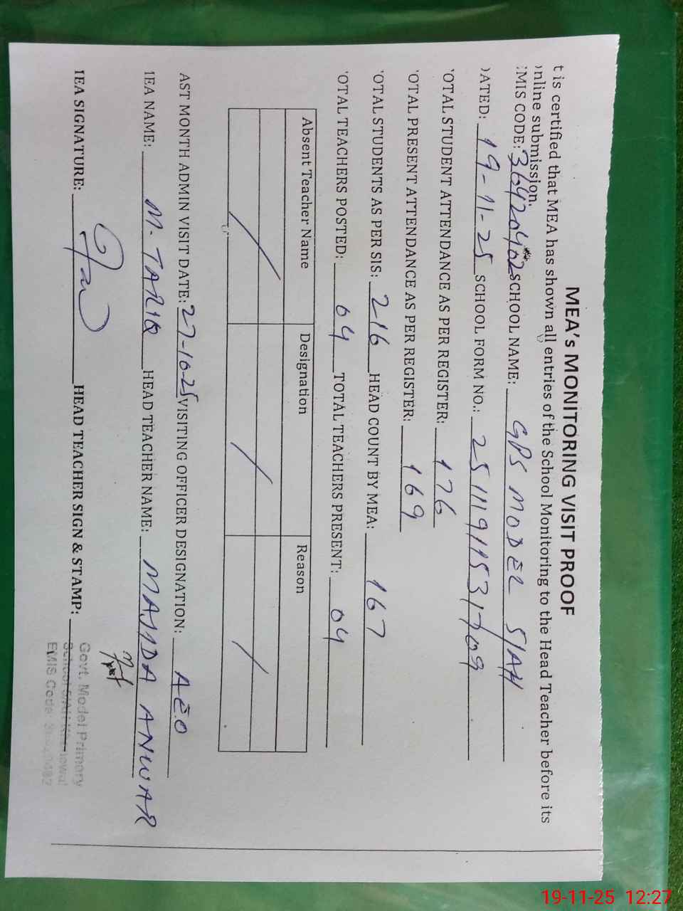 | Attendance Register | Head Teacher | MEA with School | Visit Proof |