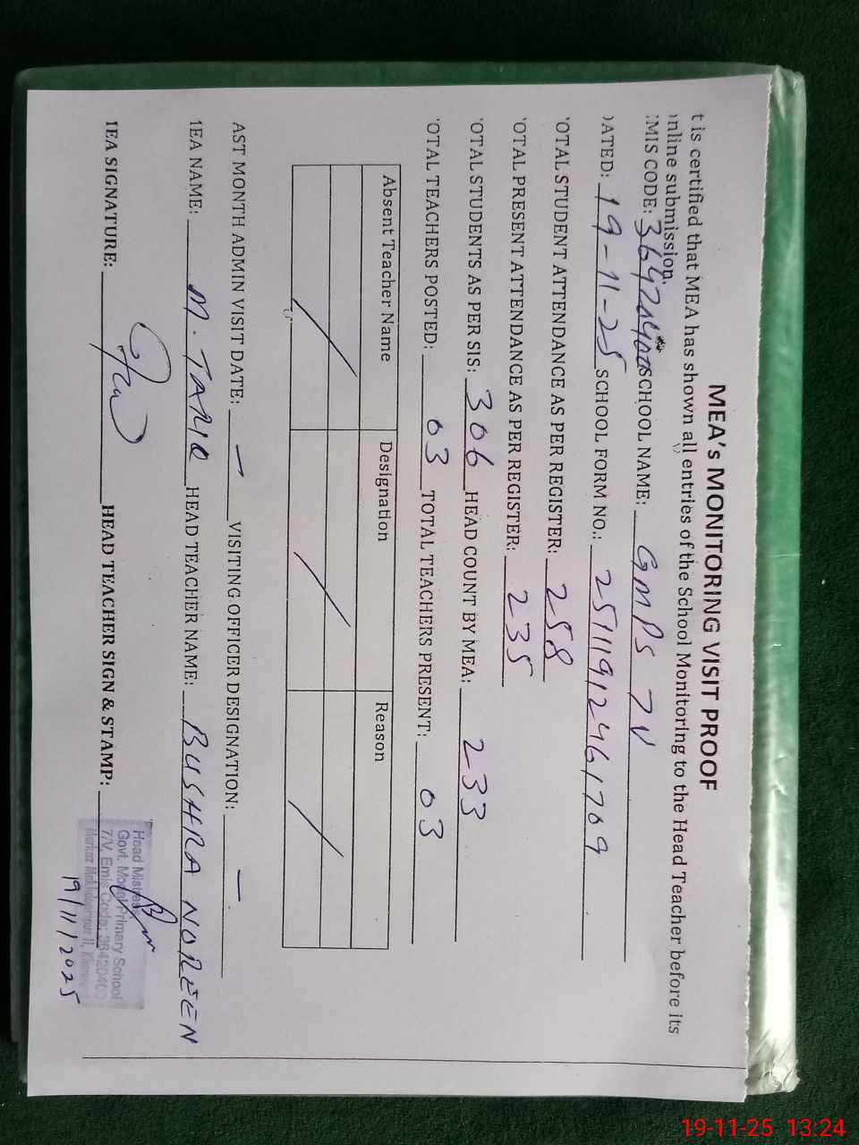 | Attendance Register | Head Teacher | MEA with School | Visit Proof |