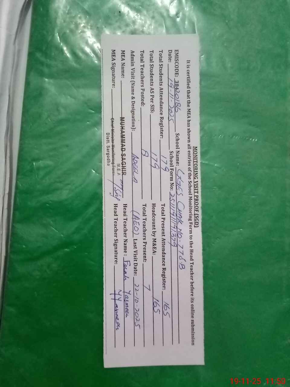 | Attendance Register | Head Teacher | MEA with School | Visit Proof |