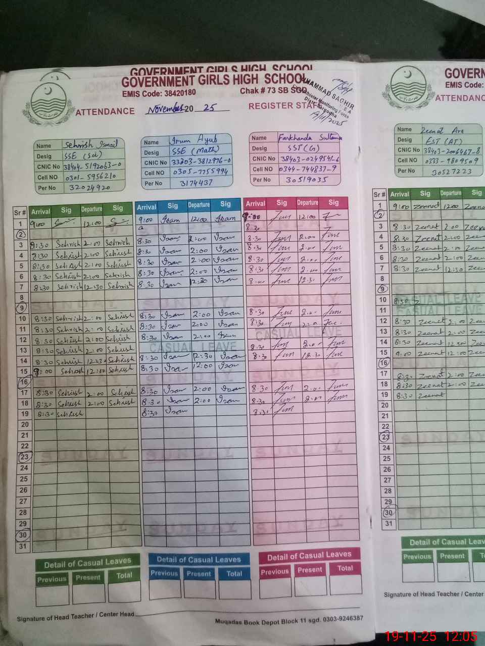 | CNIC | Full Name | Designation | R/C | Absence during last cal. month |