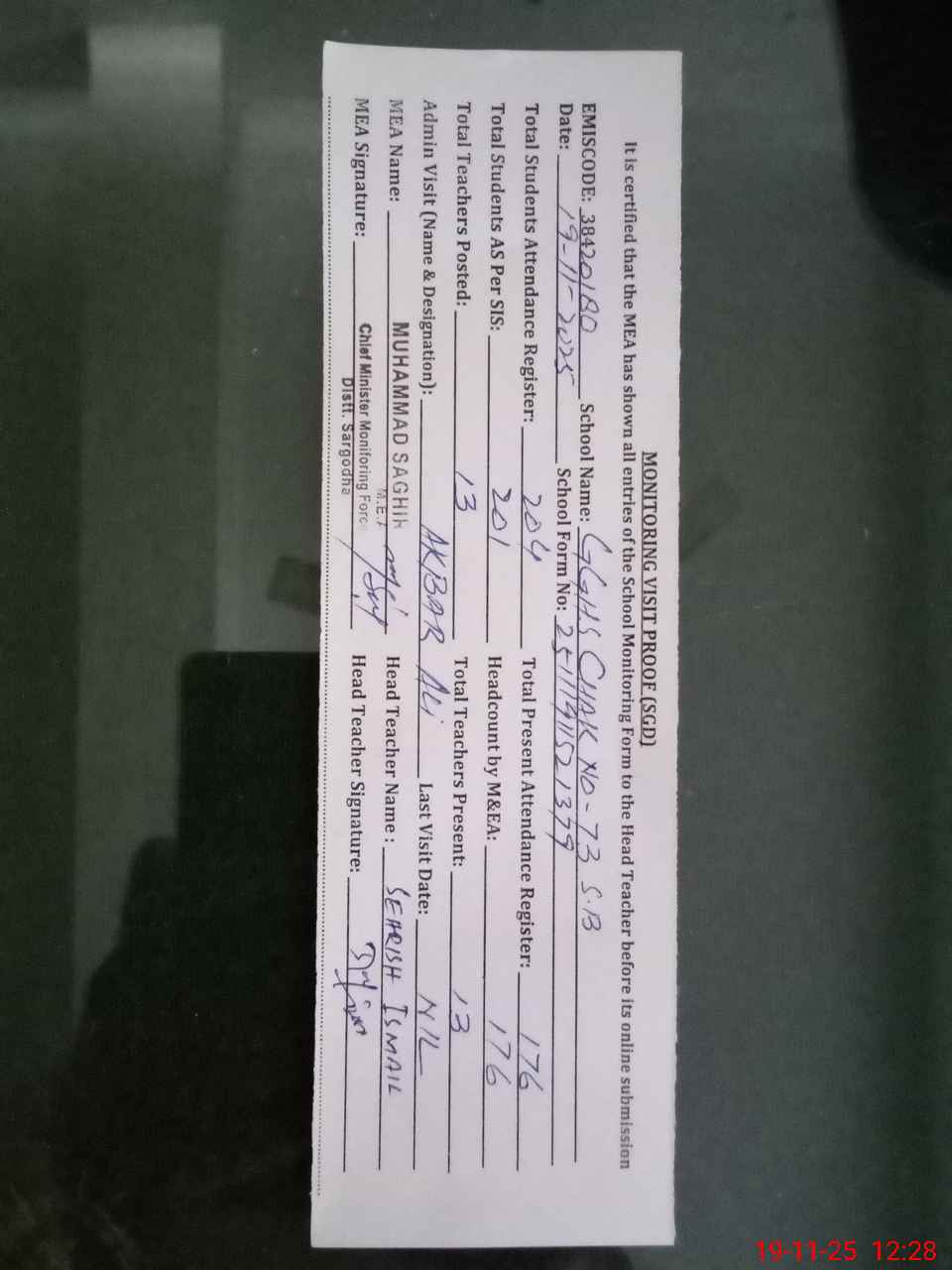 | Name: SE**** IS**** Designation: (School Headmaster's/Headmistress's) SSE I/C Phone/Cell Number: 03**** |
