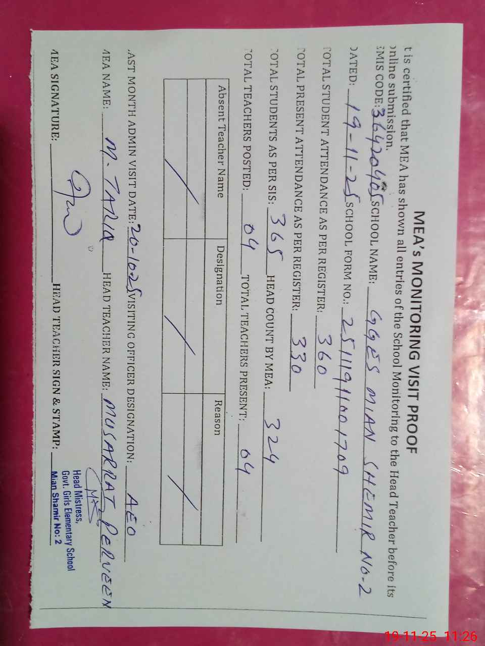 | Attendance Register | Head Teacher | MEA with School | Visit Proof |