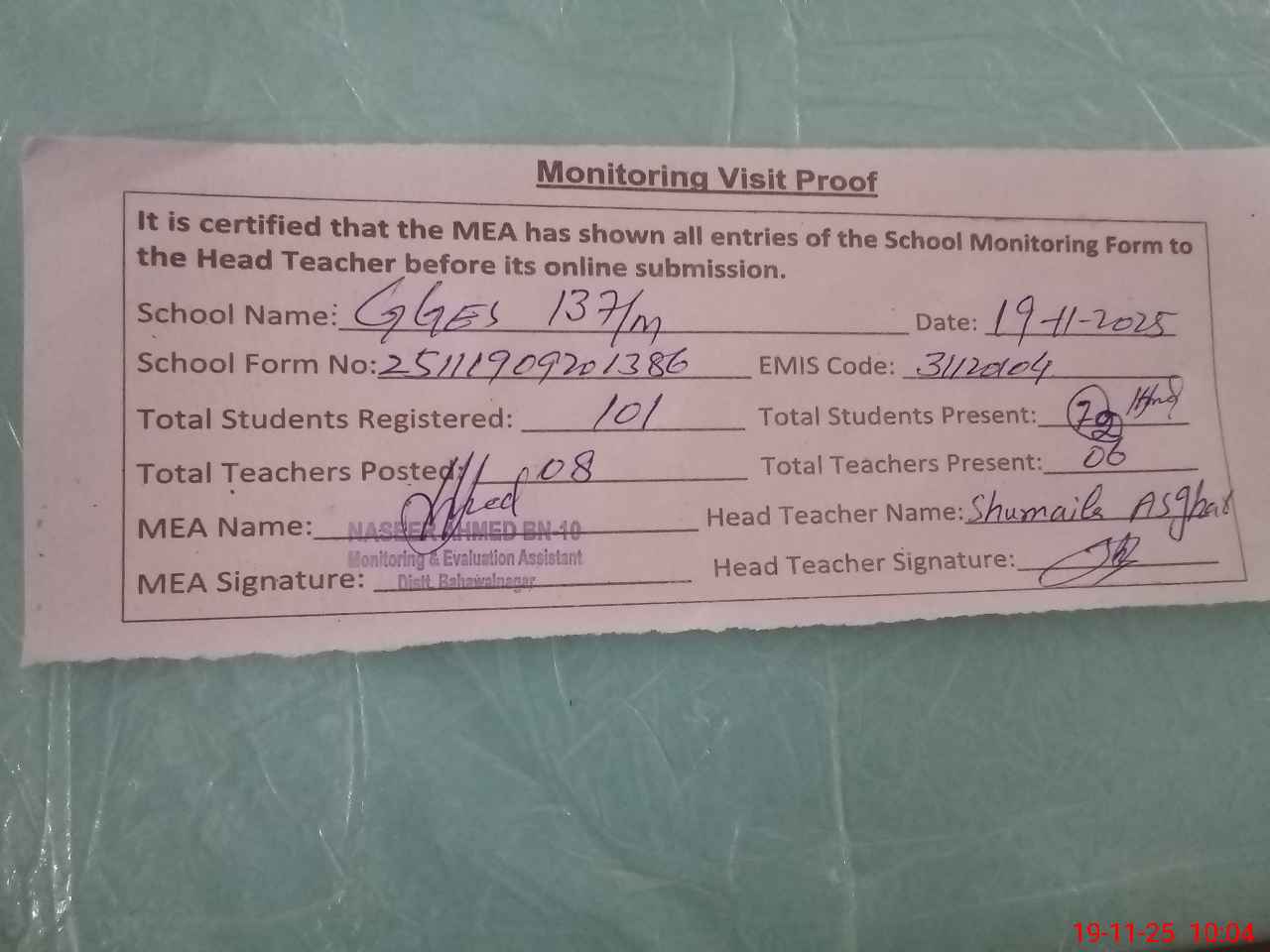 | EMIS Code: 31120104 | Name of School: GGES CHAK NO.137/MURAD | |||