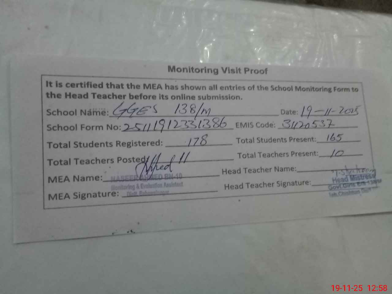 | Attendance Register | Head Teacher | MEA with School | Visit Proof |