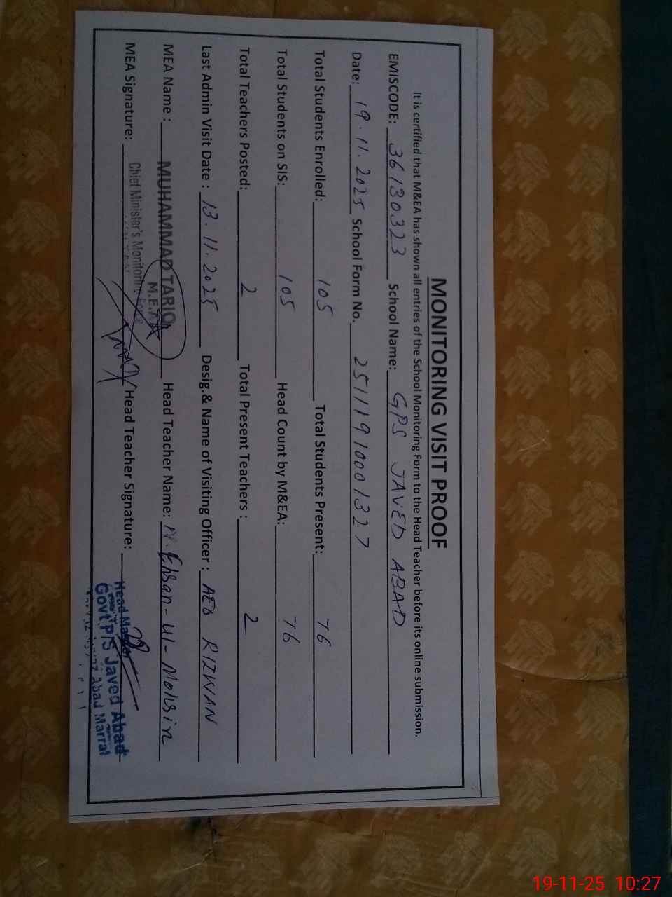 | EMIS Code: 36130323 | Name of School: GPS JAVED ABAD P/O SIKANDARABAD MULTAN | |||