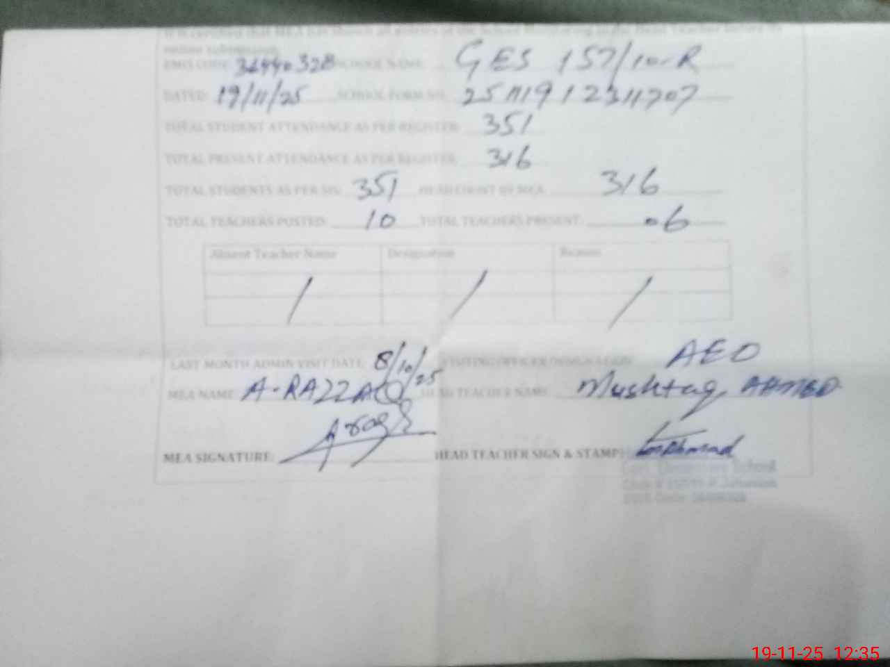 | Attendance Register | Head Teacher | MEA with School | Visit Proof |
